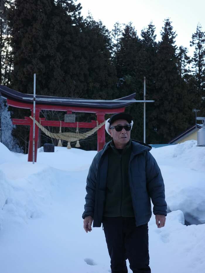 また、雪景色の中、赤い鳥居が立つ神社の境内に佇むお父さんのソロショットも披露。