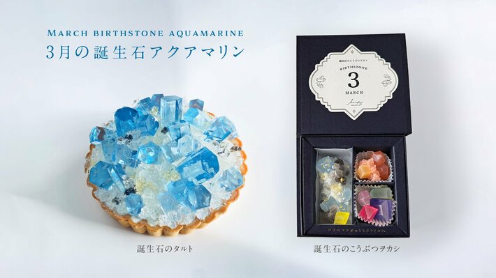 「ArtなFoodであそぶ」をテーマにプロダクトを展開するメルティングポットハラペコラボ株式会社(所在地:福岡県福岡市、以下 ハラペコラボ)から、20台で3月の誕生石アクアマリンを寒天菓子でダイナミックに表現したアイスタルト【誕生石のタルト~3月アクアマリン~】と、琥珀糖ボックス【3月のこうぶつヲカシ-誕生石アクアマリン-】を、公式オンラインストアにて2026年2月20日(金)正午より販売開始いたします。