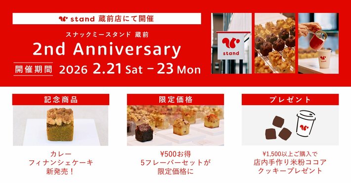 株式会社スナックミー(本社:東京都中央区 / 代表取締役:服部慎太郎)が運営する、東京・蔵前にある「snaq.me stand(スナックミースタンド)蔵前」は、2026年2月をもってオープン2周年を迎えます。