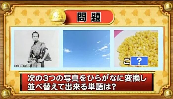 最後は、シャッフル写真問題。次の3つの写真をひらがなに変換し、それらを並べ替えて出来る単語は何でしょう?