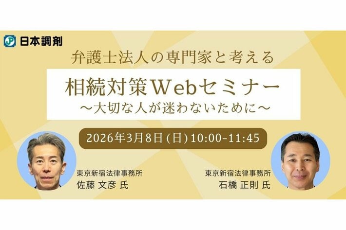 薬局の新たな価値を提供する日本調剤株式会社(本社:東京都港区、代表取締役社長:小城 和紀)は、すべての人が人生を自分らしく過ごすためのライフサポート事業の一環として、「大切な人が迷わないための相続」をテーマにした無料Webセミナーを3月8日(日)に開催いたします。