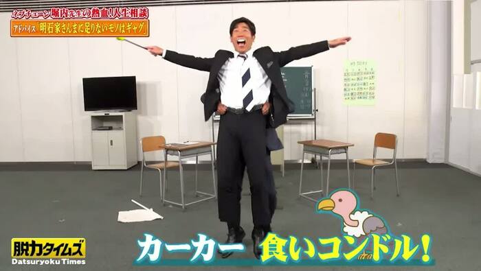 堀内さんは、さんまさんに、カラスのように両手を羽ばたかせ「カー、カー、カー。もう夕方カァ~!」と言わせたうえで、背後に回り、ベルトをつかんで持ち上げ…「カーカー、食いコンドル!」を完成させました。