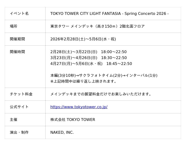 株式会社ネイキッド(英語表記:NAKED, INC. 、所在地:東京都渋谷区、代表:村松亮太郎)は、高さ150mの東京タワーメインデッキ(2階北面フロア)にて、2026年2月28日(土)~5月6日(水・振休)までの期間、プロジェクションマッピングショー『TOKYO TOWER CITY LIGHT FANTASIA - Spring Concerto 2026-』を制作・演出を手がけます。