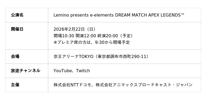 「All for Streamers」をコンセプトに、YouTube・Twitch・Mirrativなど各配信プラットフォームで活動する配信者(VTuber/ストリーマーなど)を支援する株式会社ミラティブ(本社:東京都目黒区 代表取締役:赤川隼一)は、2026年2月22日(日)に、京王アリーナTOKYOで開催される『Lemino presents e-elements DREAM MATCH APEX LEGENDS(TM)』へMirrativ配信者が出演することをお知らせいたします。