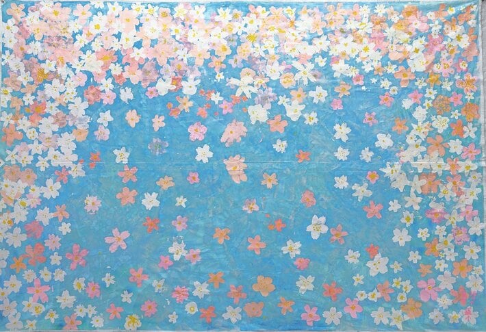 12年目となる2025年は、松坂屋上野店のリクエストで「さくら」をモチーフに旗を制作。岩手県大船渡市立盛小学校、猪川小学校と東京都台東区立谷中小学校の約半年をかけた共同作業により、縦2m、横3mの「むすびの旗」が2枚完成しました。