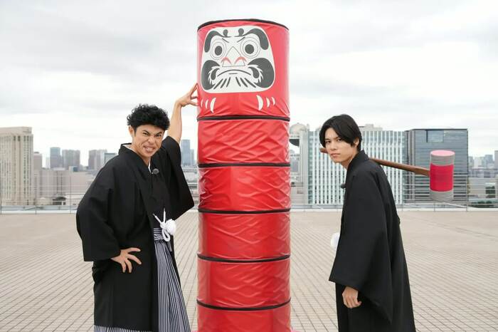 揃いの羽織袴で凛々しく決めた萩原さんと小島さんが、まず挑戦した「お正月の定番遊び」は、だるま落とし。