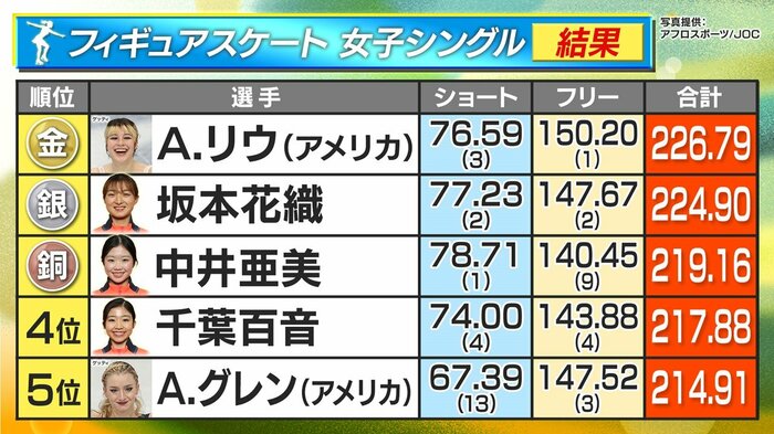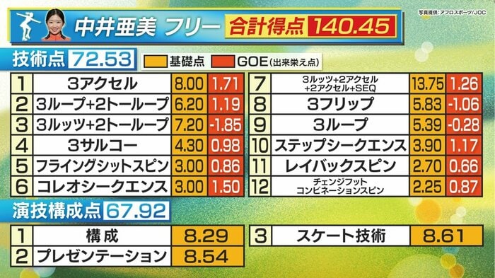 やはり冒頭のトリプルアクセルで、出来栄え点+1.71をもらえる、すごくいいジャンプを跳んでいたんです。ショートもフリーも合わせて両方しっかりトリプルアクセルをしっかり決めてくる、しかも五輪という大舞台で決めてこれるというところが、まずすごい。
