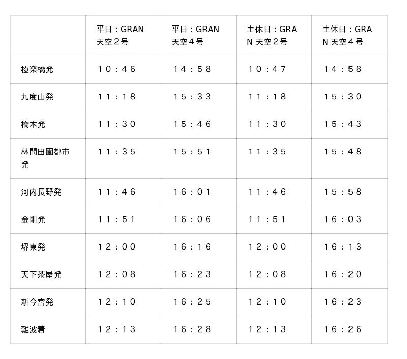 南海電気鉄道株式会社(社長:岡嶋 信行、以下「南海電鉄」)は、2026年4月24日(金)※に運行を開始する「GRAN 天空(グラン テンクウ)」の1・2号車の特急券および4号車の各種プランを、4月1日(水)10時から発売します。また、各駅の発着時刻および料金の詳細が決定しました。