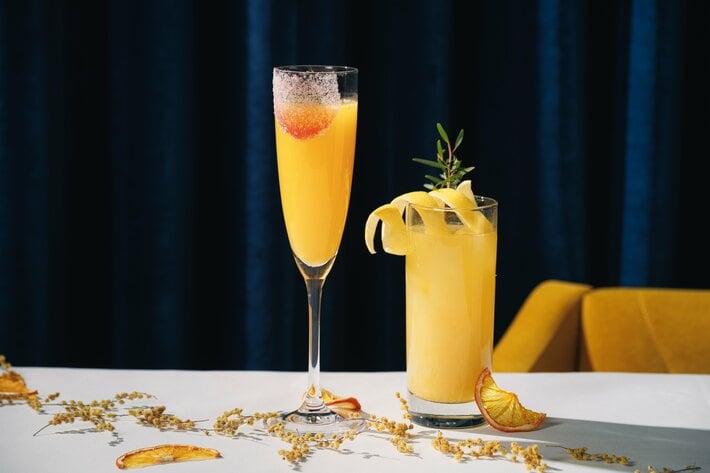六本木本店と紀尾井町店では、カモミールを漬け込んだシロップとオレンジジュースのベースにスパークリングワインを合わせ、グラスの縁にグレナデンで色を付けたシュガーをあしらった、ミモザのように華やかに輝く“感謝の証”を表現した「Glittering MIMOZA」をご用意。京都店とKITTE大阪店では、やさしい甘味と香りのあるピーチリキュールと、その甘さを引き締める白ワイン、ふわりと香り立つローズマリーを使用し、“日常から少し離れ、自分自身を労わる時間を過ごしていただきたい”という想いを込めた「Mimosa Blanche」をご用意しました。