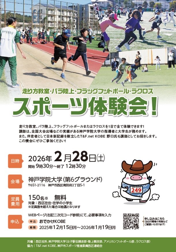 神戸学院大学は、地域連携の取り組みの一環として、神戸市西区在住・在学の小学生を対象としたスポーツ体験会を2月28日(土)、本学第6グラウンドにて開催します。