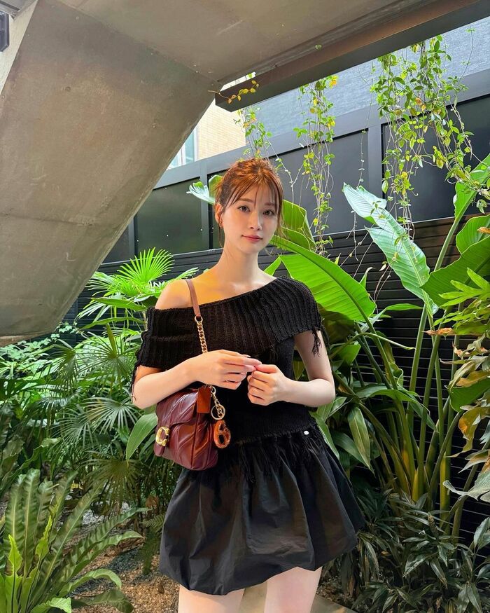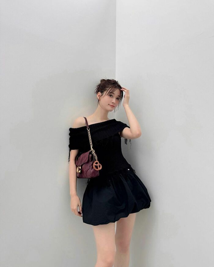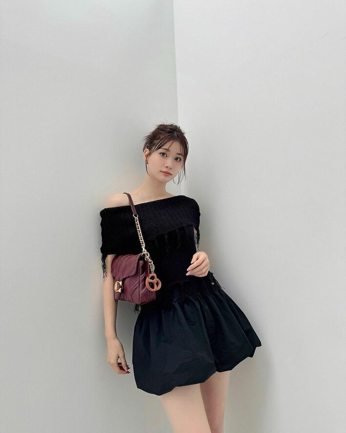 赤いバッグに、ニット素材の黒いトップスを組み合わせ秋らしさを演出しながらも、ミニ丈のスカートと肩を出した着こなしで美脚とデコルテをのぞかせ上品なセクシーさを見せています。