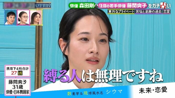 シウマさんが「相手をリスペクトできるか。『ご飯の食べ方が汚い!』と思ったら嫌いになる」と占うも、藤間さんは「そこは許せる。そんなにこだわりがない」と否定。