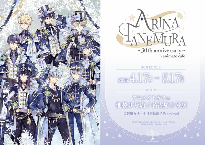 原画展「種村有菜 30周年記念展 きらめく少女たちの夢物語」の開催を記念して、アニメイトカフェとのコラボレーション「種村有菜×animate cafe ~30th anniversary~」が決定!本コラボカフェは、2026年4月17日~5月17日まで実施。東京会場近郊の「アニメイトカフェ池袋3号店」と、種村有菜氏の故郷である愛知県の「アニメイトカフェ名古屋2号店」にて、開催されます。会期中は、種村有菜氏の各作品をイメージしたコラボメニューを提供するほか、オリジナルグッズの販売も!カフェのご来場に当たっては、いずれの店舗も、全日程アニメイトカフェ抽選予約システム内でのWEB抽選予約が必須です。オリジナルグッズの情報解禁を始めとする最新情報はアニメイトカフェ公式サイト・公式SNS(@animate_cafe)にて随時お知らせいたします。
