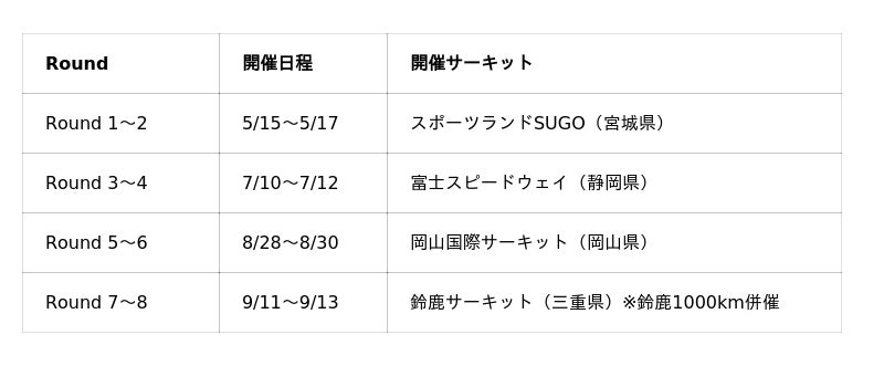 初戦は、5月15日「スポーツランドSUGO」にて開催される
