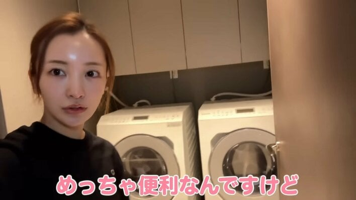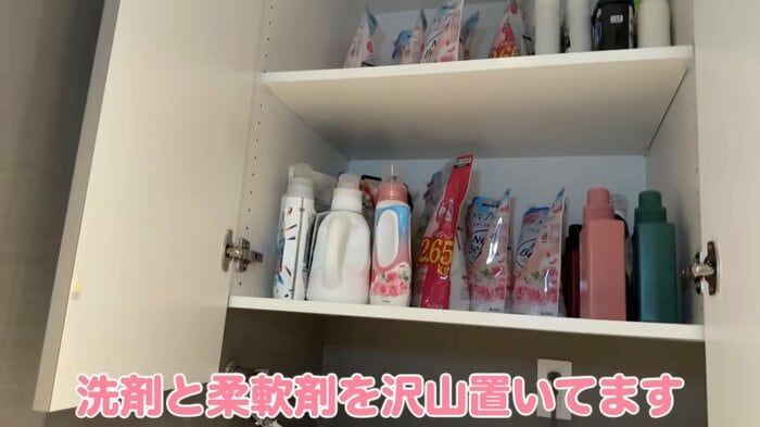 さらに洗濯機の上には大きな戸棚があり、中には洗剤や柔軟剤がぎっしり!洗う物によって使用する物を変えているのか、さまざまな種類が用意されているようで、板野さんは「なくなるのが怖いからたくさん買っている」と、家庭的な一面ものぞかせました。