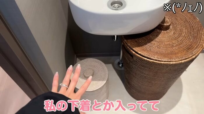 一般的に見られる洗濯カゴとは違い、ふた付きなのもポイントの1つで、板野さんは、汚れたものが見えないようにという思いから、あえてふた付きのものを選んでいるとこだわりを明かしました。