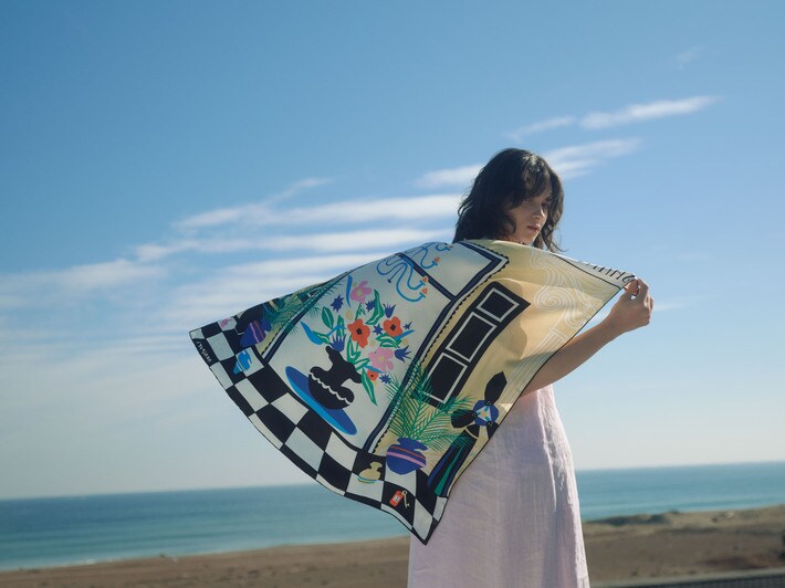 マニプリは2009年設立のスカーフをメインにしたライフスタイルブランドです。「絵画を身にまとうようにマニプリスカーフを楽しんでほしい」という願いから、首元だけでなくヘッドアクセサリーやチューブトップのように、ボディに巻く新しいスタイルを提案しています。