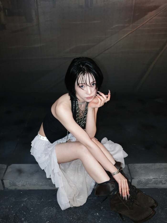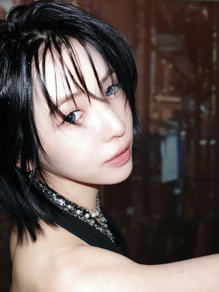 ひんやりと澄んだ光を宿した青い瞳で、振り向きざまにこちらを見つめたショットも披露!その視線は、今にも吸い込まれそうな透明感と奥行きがあり、ふっと引き寄せられるような吸引力があります。