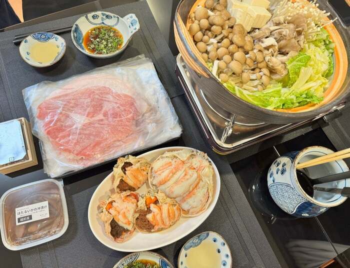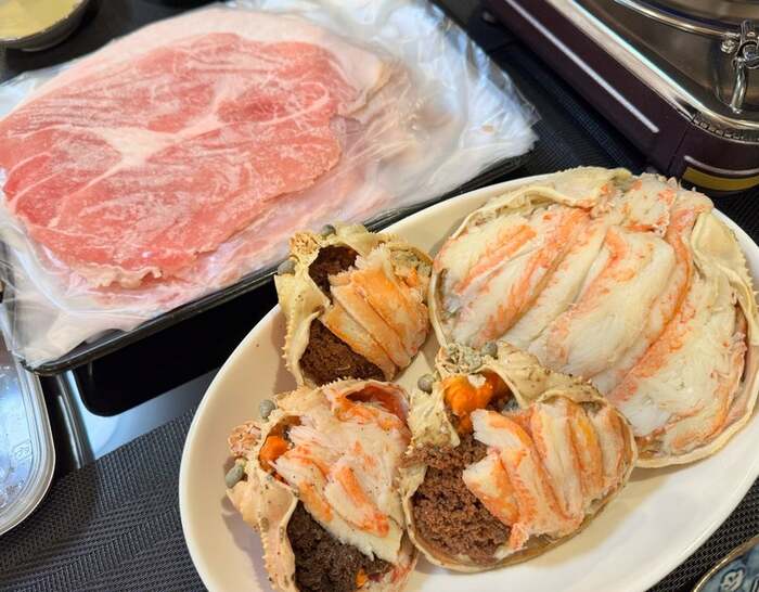 「50代最後の日 沖縄県のアグー豚のしゃぶしゃぶ 福井県の越前がに・せいこがに」と、テーブルには食材がずらりと並んでいます。