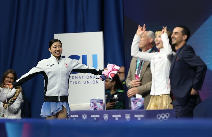 観客からの歓声に答えるアリサ・リウ選手の方に体を向けて、笑顔を浮かべています。