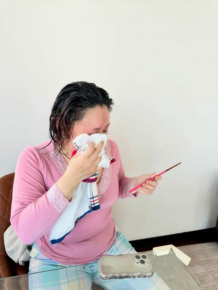 続くカットでは、タオルを目元に当てて、涙を拭っているようなしぐさや…