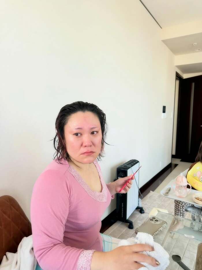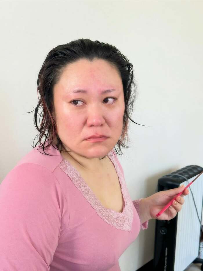 そこには、ピンク色のインナー姿で、髪の毛をオールバックにしたバービーさんの姿が。目元が潤んでいるように見えます。