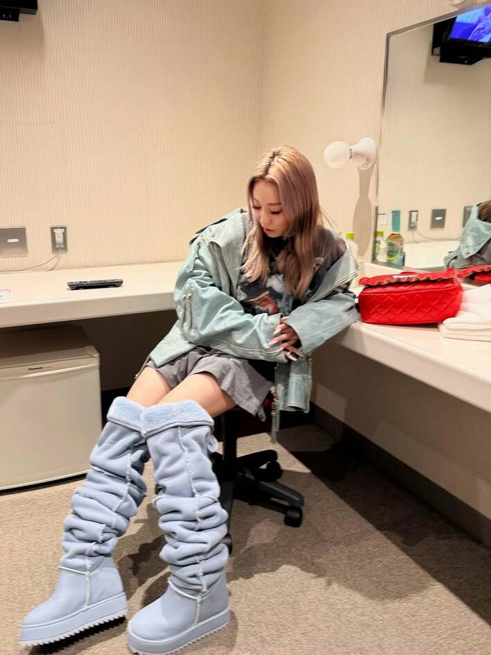 太ももまであるグレーのTシャツに水色の暖かそうなニーハイブーツを合わせたコーディネートは、さすがの着こなしです。