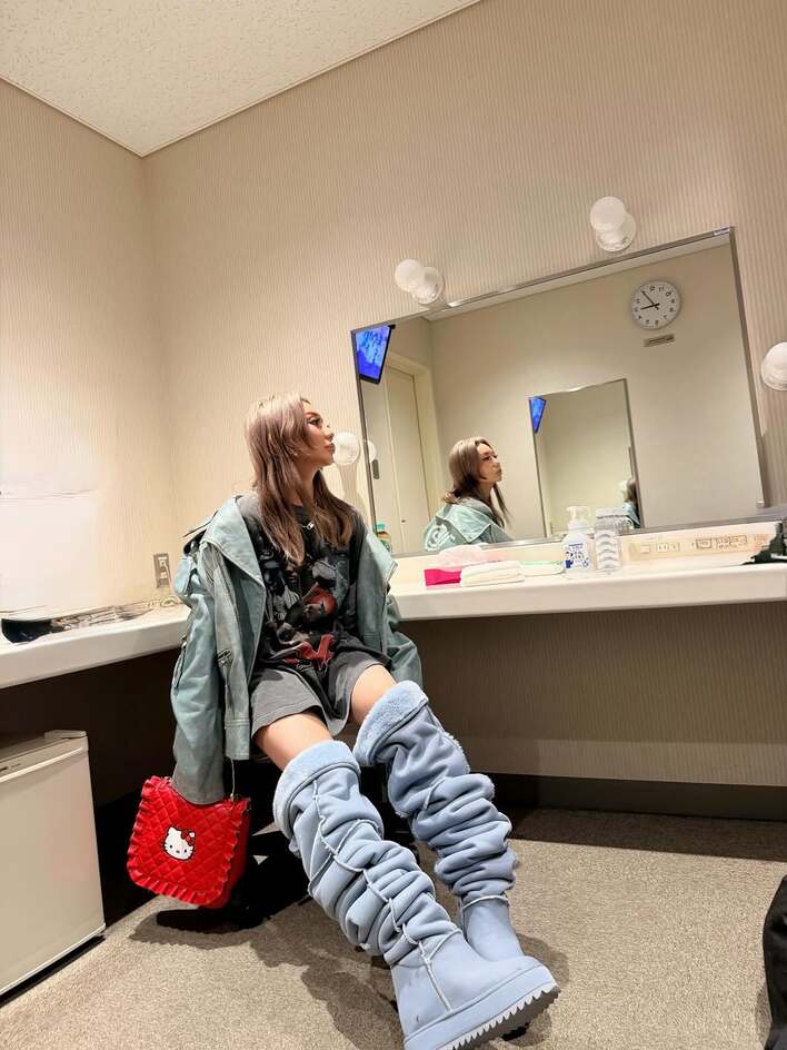 “絶対領域”見せのミニ丈×ニーハイブーツを合わせた私服コーデを披露しました。