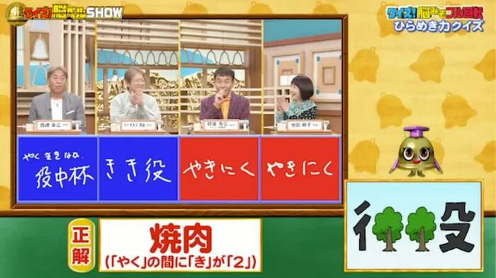 正解は「焼肉(『やく』の間に『き』が『2』)」。肥後さん、池田さんが正解。