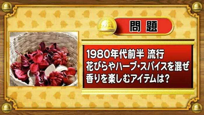 次は、ブームの問題。今からおよそ40年前の1980年代前半、小学生の女の子たちを中心に流行した、花びらやハーブ・スパイスを混ぜ、香りを楽しむアイテムの名前は何でしょうか?