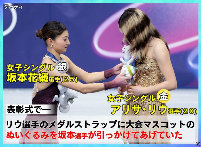 表彰式では優勝したアリサ・リウ選手(20・アメリカ)のメダルストラップに大会マスコットのぬいぐるみを引っかけてあげる場面も見られました。