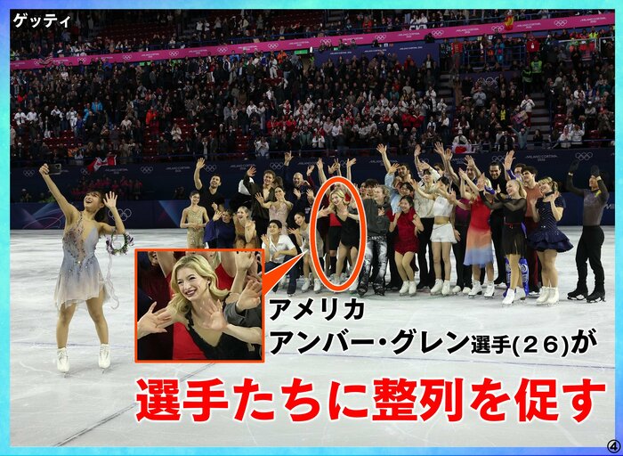 エキシビション終了後に、坂本選手が自撮りで集合写真を撮影していたのですが…この時、坂本選手がカメラを準備している後ろで、「みんなもっと近くに寄って」と言わんばかりに、指示を出していたのは、アメリカのアンバー・グレン選手(26)。