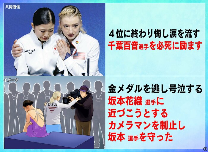 4位に終わり悔し涙を流す千葉百音選手を隣で励まし続けたり…金メダルを逃し、号泣する坂本花織選手に近づこうとするカメラマンを制止して、坂本選手を守ったとも話題にもなりました。