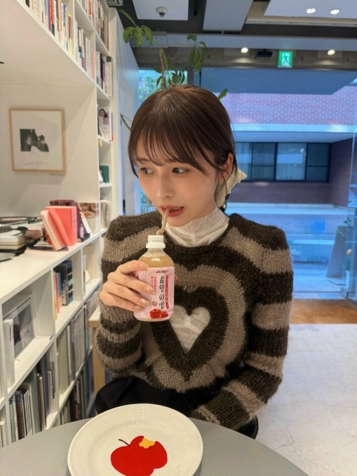 そこには、白のレースの上に、真ん中がハートの形に切り抜かれたブラウンのチェック柄のニットを合わせた長濱さんの姿が。髪を低い位置でお団子にまとめ、ストローをさしてりんごジュースを味わっています。