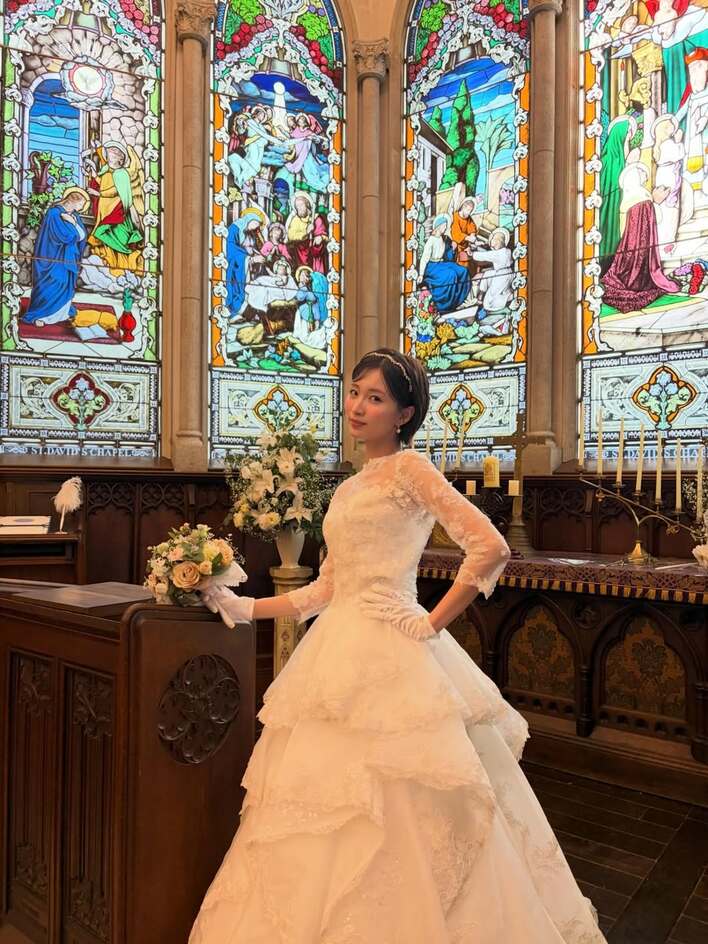 また、色鮮やかなステンドグラスが目を引く教会のような場所で、片手で花束を持ち、もう片方の手を腰に当てカメラに目線を送る様子も。