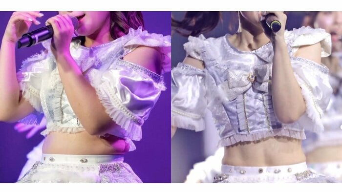 半年前と同じ衣装のようですが、以前の柔やかなシルエットのウエストは驚くほどシャープなラインに変化しています!腹筋にはくっきりと縦に線が入っていて、バキバキの仕上がりに。