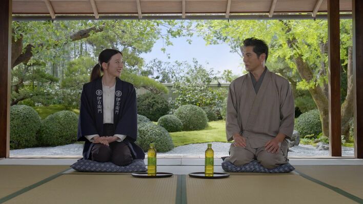 新TVCM「二人の茶匠」篇では、本木さんと永野さんが伊右衛門の茶匠として、静謐(せいひつ)な茶舗の奥座敷にて、2人でつくりあげた新しい伊右衛門を自信あふれる表情で見つめ合う姿が描かれています。