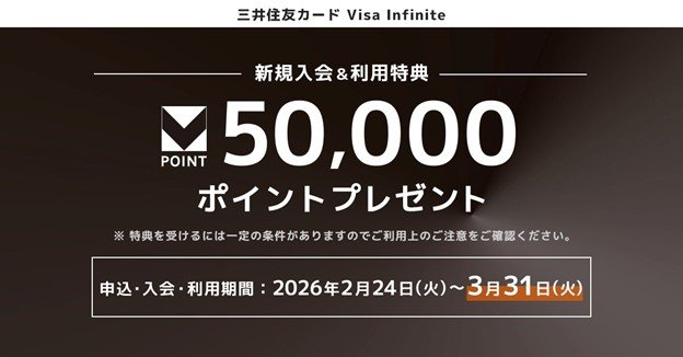 三井住友カード株式会社(本社:東京都江東区、代表取締役 社長執行役員 CEO:大西 幸彦、以下:三井住友カード)は、2026年2月24日(火)より「三井住友カード Visa Infinite」を対象とした2つの新規入会キャンペーンを開始します。本キャンペーンと、新規入会&利用特典を併せて条件達成いただくと、最大で17万円相当※ものポイントが進呈されます。この機会にぜひお申し込みください。