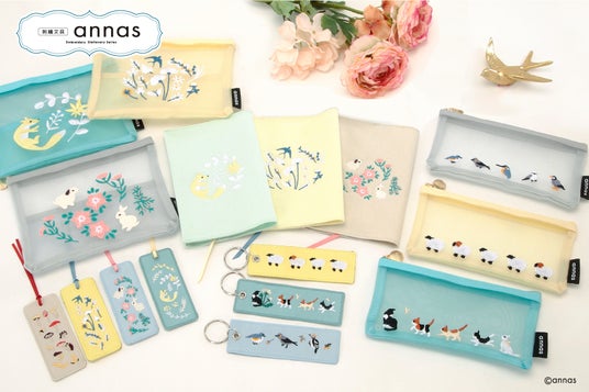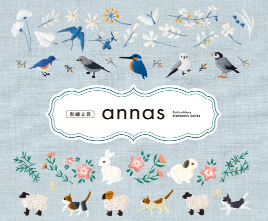 新作の文具シリーズ第2弾は、使いやすいアイテムを厳選し、刺繍作家annasさんの著書「annasの草花と動物のかわいい刺繍増補版」(河出書房新社)より、草花のやさしい色合いとちょこんとたたずむ小さな動物たちをモチーフにした刺繍を使って、大人かわいい落ち着いたデザインに仕上げています。