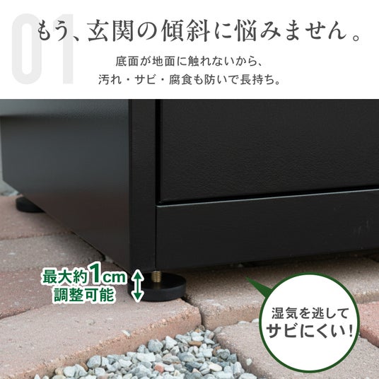 4つの脚部に独立したアジャスターを標準装備しています。玄関先のタイルの段差や、わずかな傾斜がある場所でも、ガタつくことなくピタッと水平に設置。設置場所を選ばない自由度の高さが魅力です。