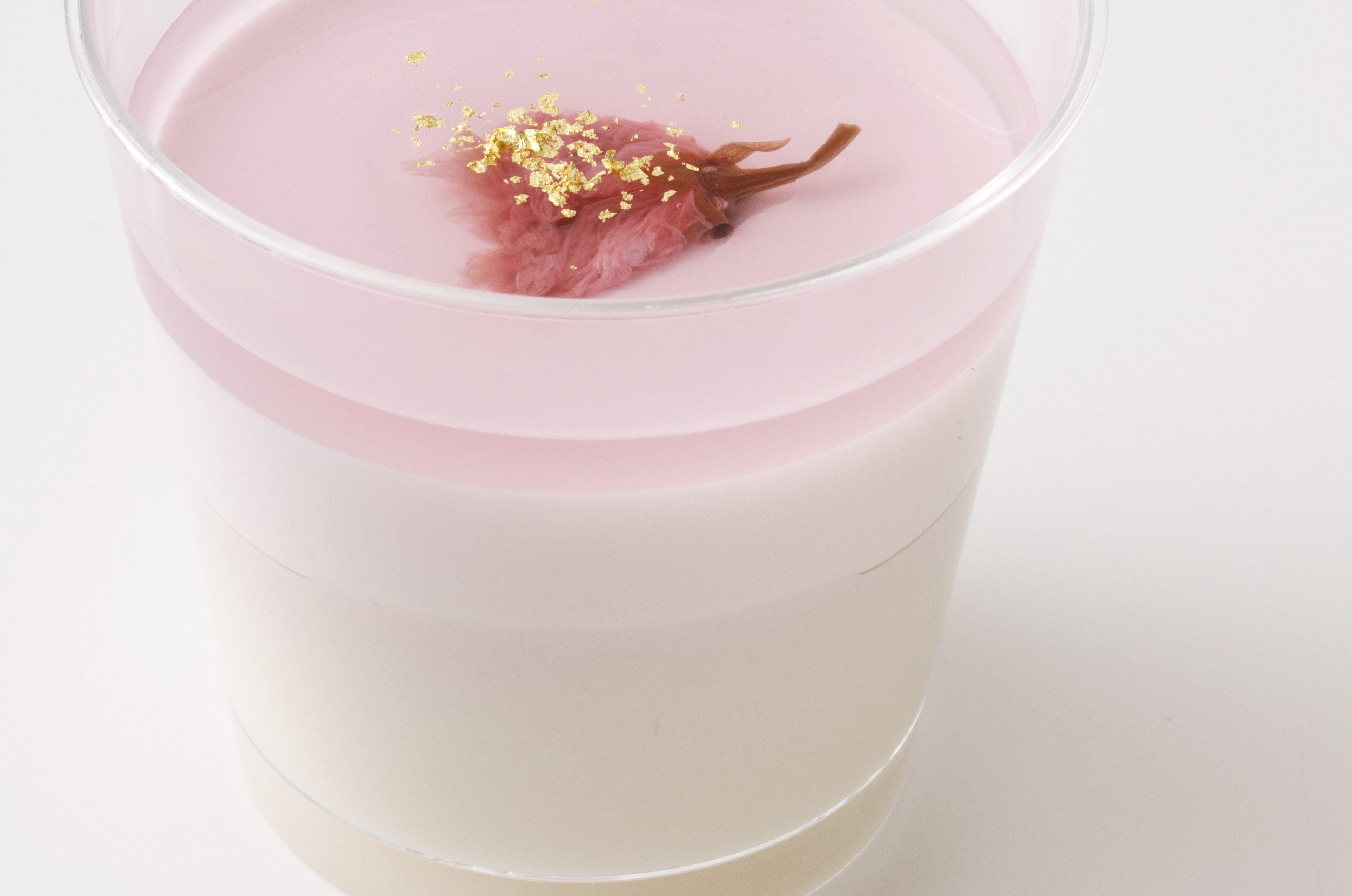三層仕立ての華やかな彩りと、桜香るやさしい甘さ上層には、金粉をあしらった桜風味のゼリー。中に忍ばせた桜の塩漬けが、ほどよい塩味で全体の甘さを引き立てます。