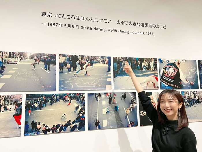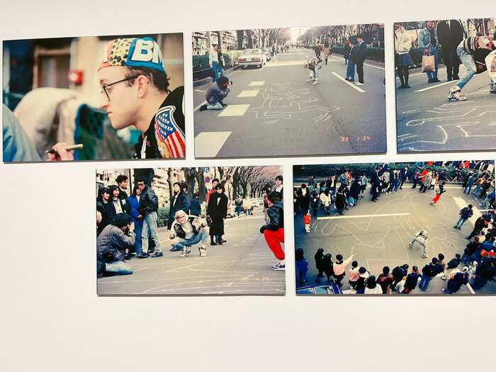 展覧会の最後のコーナーには、ヘリングさんが原宿の道路にチョークで絵を描いている写真があります。もともと東洋思想や書などに興味を持っていたへリングさんにとって日本は憧れの国でしたが、来日した頃は日本がバブルに沸いていたこともあり、「東京ってところはほんとにすごい。まるで大きな遊園地のようだ」という言葉を残しています。