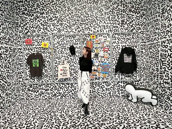 展覧会と言えばお楽しみのグッズショップの入り口には、絶好の映えスポットがあります。ヘリングワールドに囲まれたこのスペースでポーズを取ると、自分も作品の一部になったような気分が味わえます。