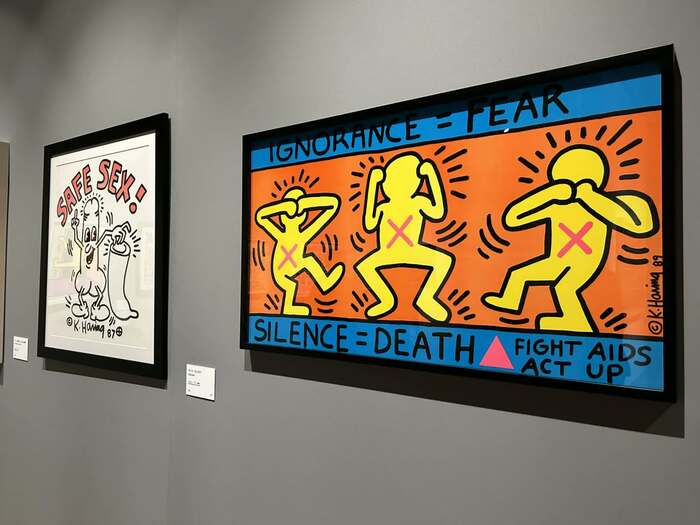 ヘリングさんは1988年にエイズと診断され、その2年後に31歳の若さで亡くなりましたが、アートを通して多くの問題提起をしていました。エイズ予防はもちろん、差別の撤廃や反戦まで幅広く問題意識を持ち、たくさんの人に訴える手段としてポスターを用いました。
