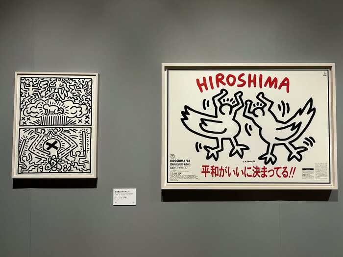 最初に作ったのは核放棄のためのポスターで、自費で2万部印刷して、ニューヨークのセントラルパークでのデモで無料で配ったそうです。「ヒロシマ、平和がいいに決まってる」という作品は広島で行われたコンサートのポスターで、キースさんは来日して広島に足を運んで制作したそうです。