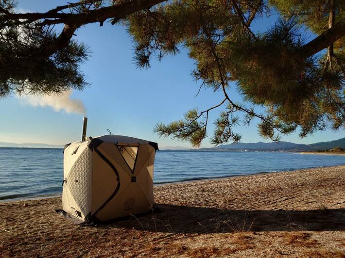 【体】= 熱 (HEAT) まずはサウナの熱で「体をいじめる」。 テントサウナ等のレンタル機材を用い、極限まで身体を温め、自身の内なる熱エネルギーを呼び覚まします。