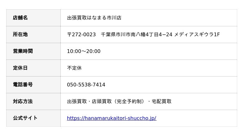 出張買取はなまる市川店(所在地:千葉県市川市南八幡4丁目4−24 メディアスギウラ1F)は、