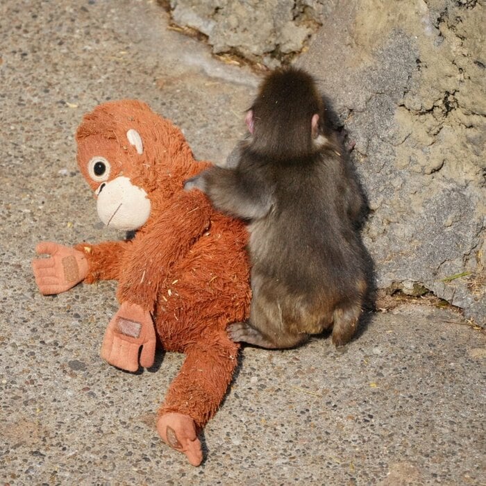 “母代わりのぬいぐるみ”と共に、群れの一員になろうと奮闘しているパンチくん。