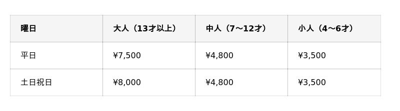 ※4月27日(月)、4月28日(火)、4月30日(木)、5月1日(金)は土日祝日料金です。