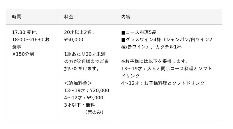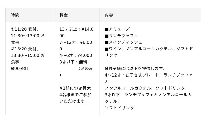 【ディナーブッフェ 料金表】